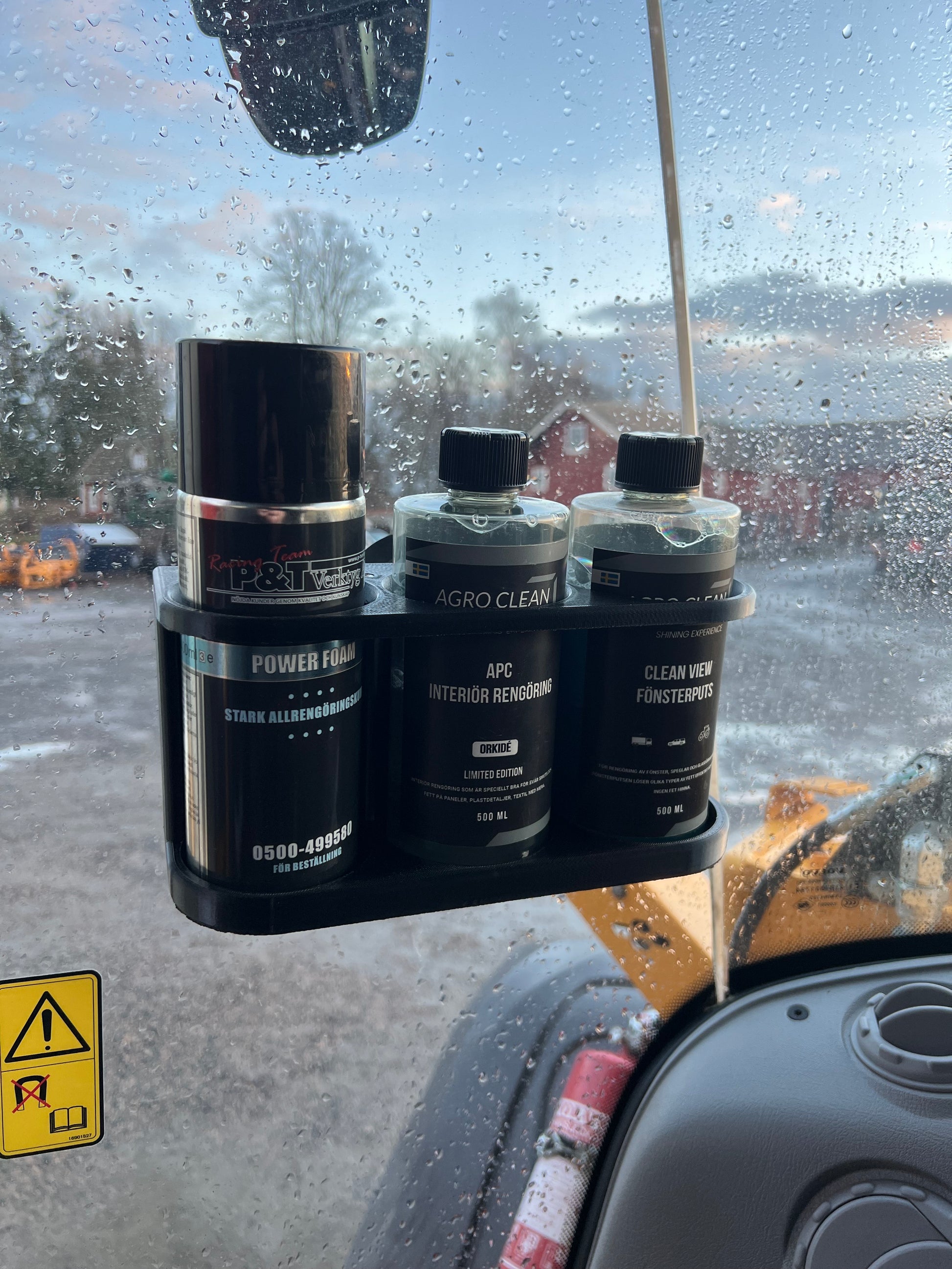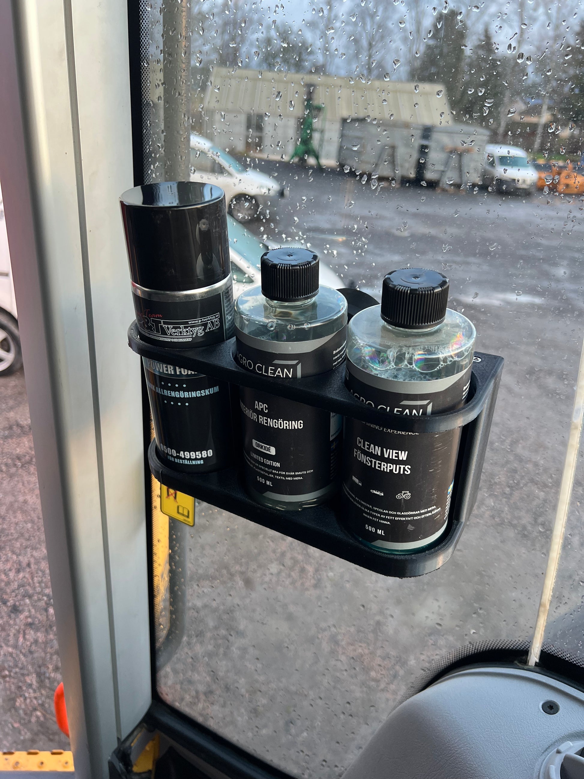 Flaskhållare med plats för tre 500 ml-flaskor. Varje plats är anpassad för flaskor med en maximal diameter på 74 mm. Hållaren är tillverkad i plast och producerad med hjälp av 3D-teknik.